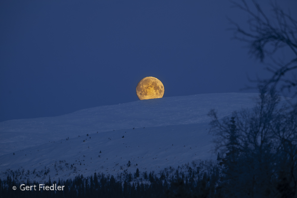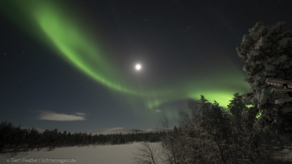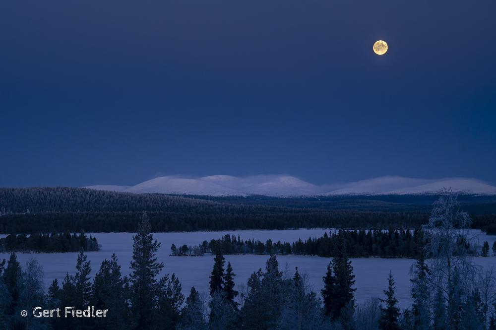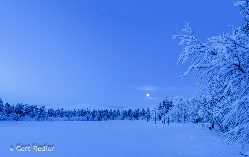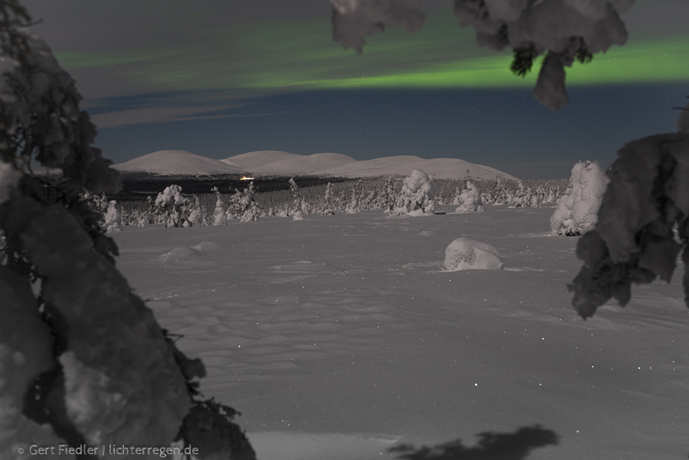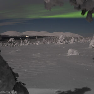 Kaamos ist auch das charakteristische blaue Licht kurz vor der Dunkelheit der Nacht, die helle, schneebedeckte Landschaft im Mondlicht und das mystische, farbenprächtige Polarlicht.